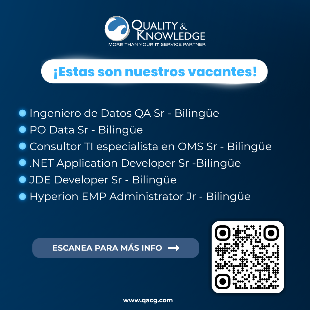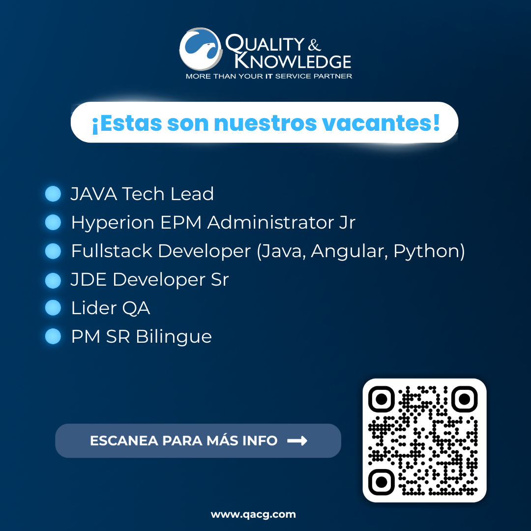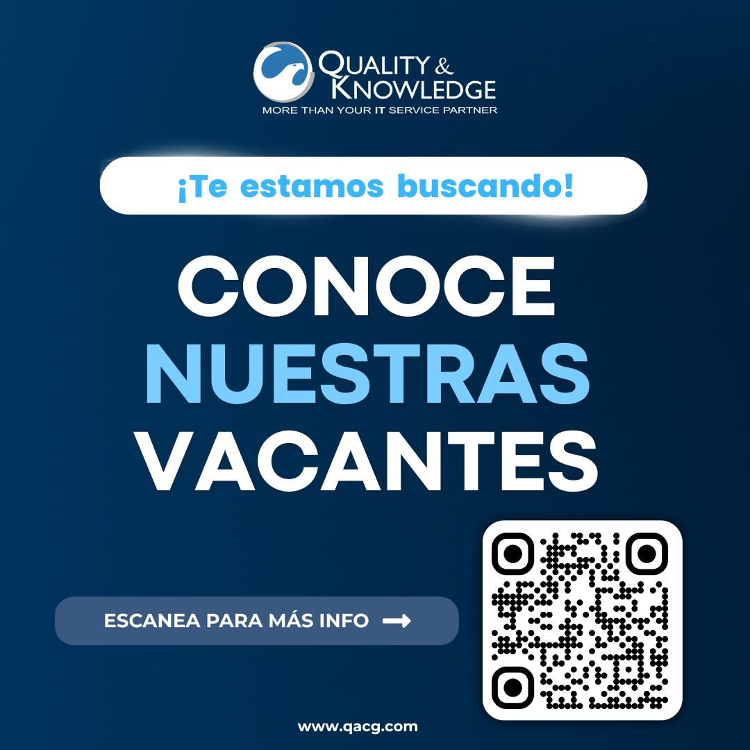 VACANTES DISPONIBLES POSTULARME Aviso de privacidad Llámanos Contáctanos Tecnologías Servicios y Productos © 2025 Quality & Knowledge on IT Services All Rights reserved. Escríbenos Únete al Equipo Desarrollo de Software Reclutamiento Pruebas Automatizadas Consultoria IT Ciberseguridad Inteligencia Artificial Oficinas CDMX Oficinas Xalapa, Ver. Oficinas EE. UU. Encuéntranos